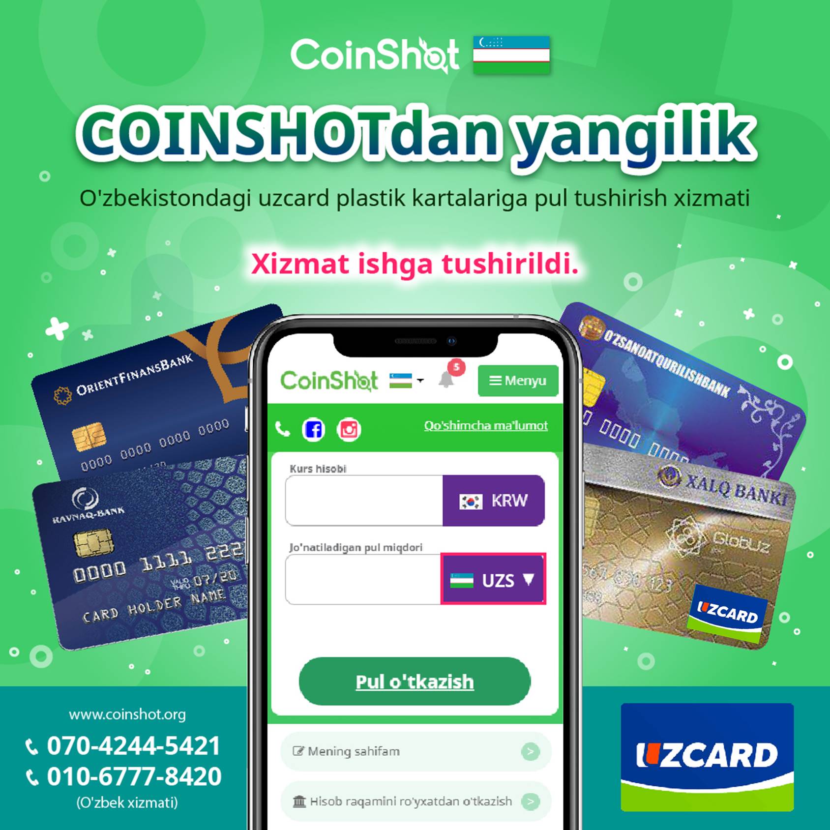 Coinshot yordamida pul o'tkazmalarini amalga oshiring! Biz bilan pul o'tkazmalari arzon va qulay!